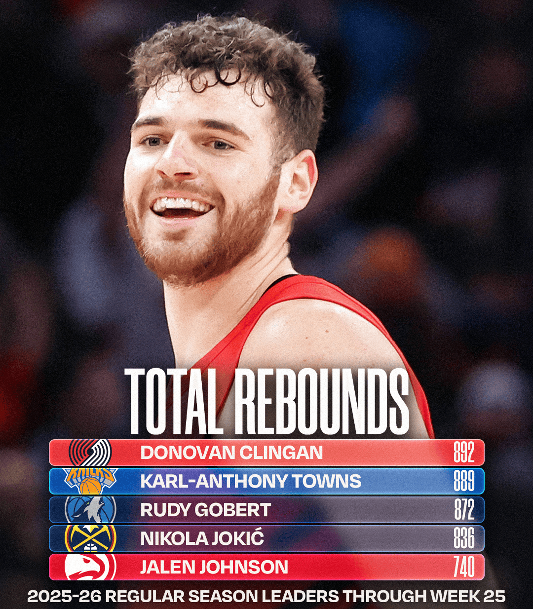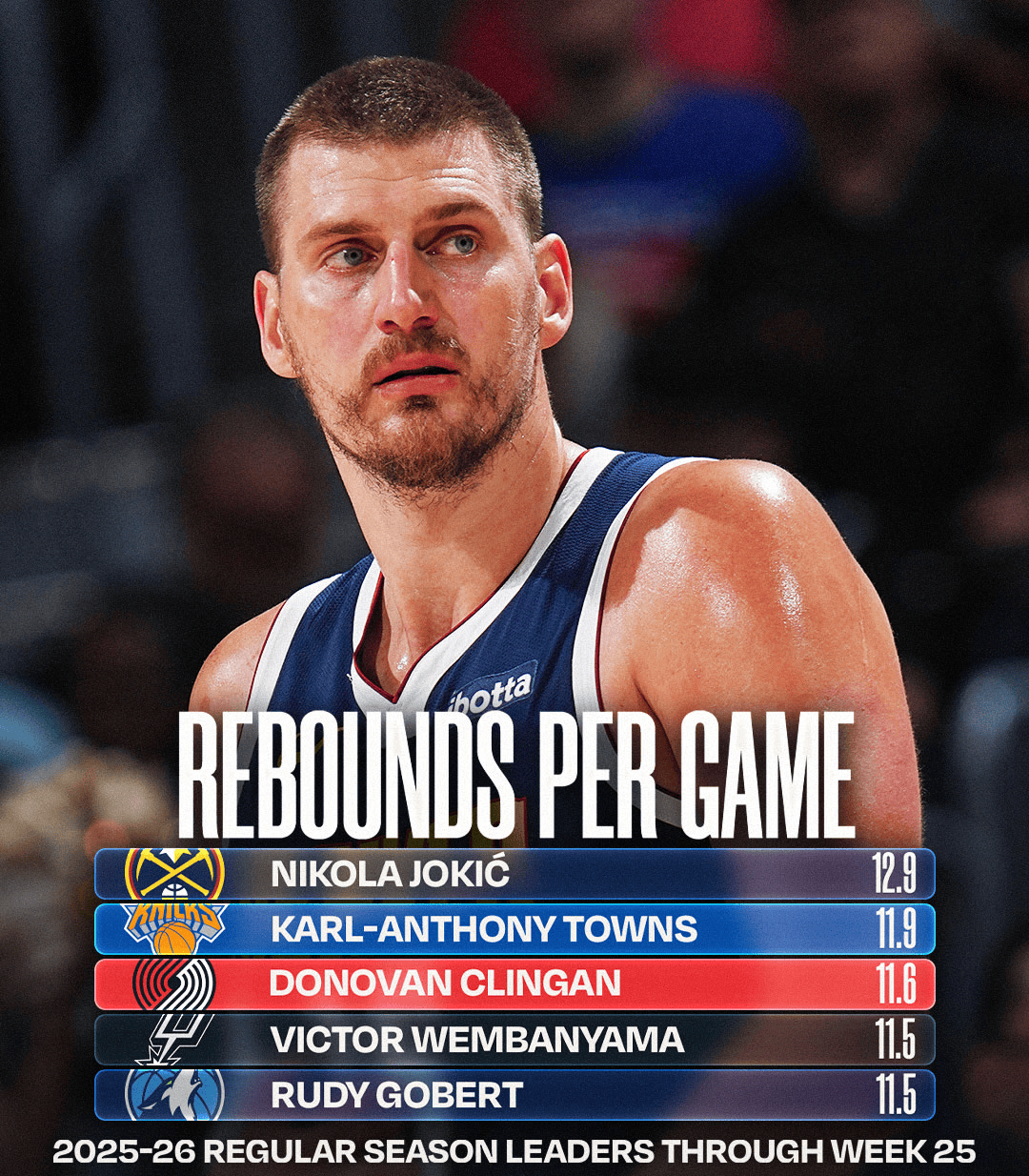 虎扑04月14日讯 NBA官方分享本赛季常规赛球员篮板榜;