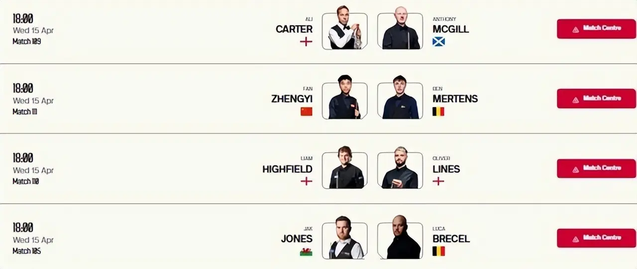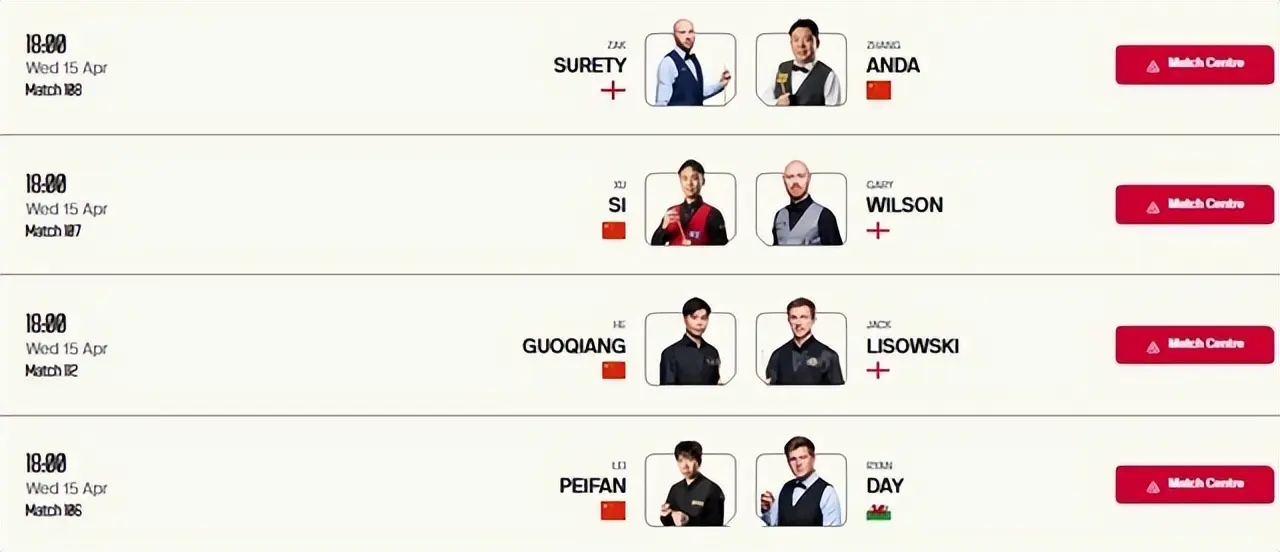 4月15日18点:扎克舒尔第vs张安达,徐思vs加里威尔逊,国强vs利索夫斯基,雷佩凡vs瑞恩戴,阿里卡特vs麦克吉尔,范争一vs本默滕斯,海菲尔德vs奥利弗莱恩斯,杰克琼斯vs布雷切尔。