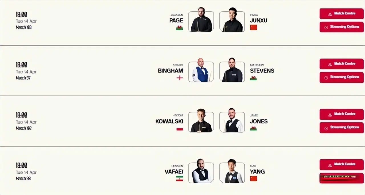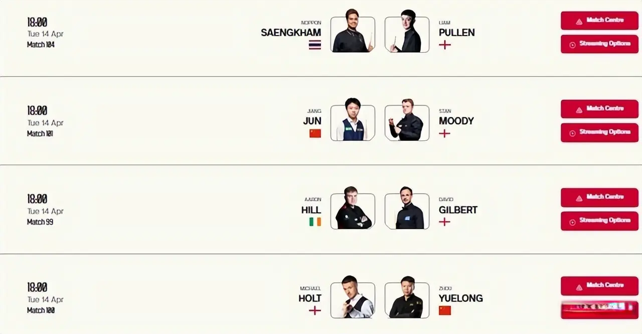 北京时间4月14日18点:桑坎姆vs利亚姆普伦,江俊vs斯坦穆迪,亚伦希尔vs吉尔伯特,迈克尔霍尔特vs周跃龙,杰克逊佩奇vs庞俊旭,宾汉姆vs马修史蒂文斯,科瓦尔斯基vs杰米琼斯,瓦菲vs高阳。
